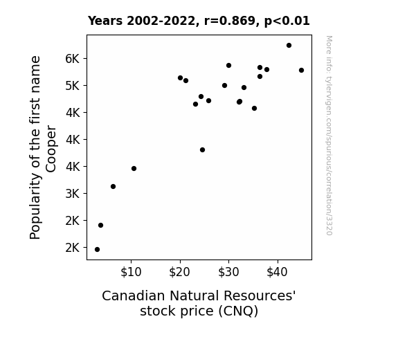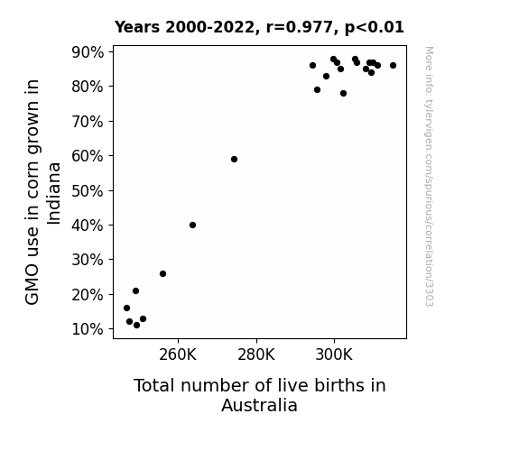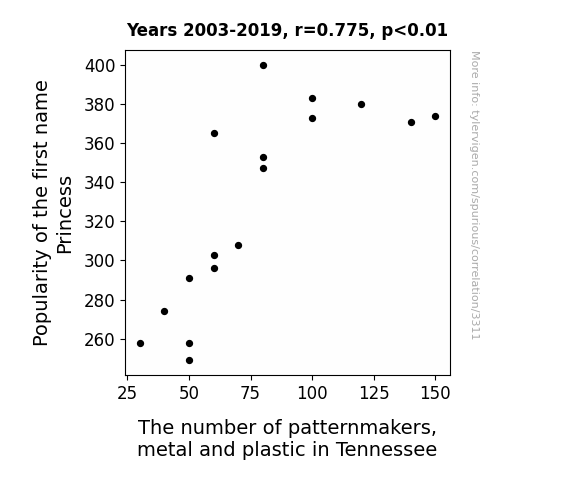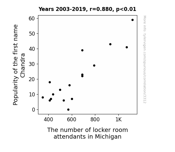 This is exacerbated by the fact that I used "Years" as the base variable. Lots of things happen in a year that are not related to each other! Most studies would use something like "one person" in stead of "one year" to be the "thing" studied. - Observations not independent: For many variables, sequential years are not independent of each other. You will often see trend-lines form. If a population of people is continuously doing something every day, there is no reason to think they would suddenly change how they are doing that thing on January 1. A naive p-value calculation does not take this into account.