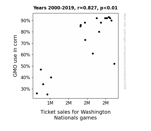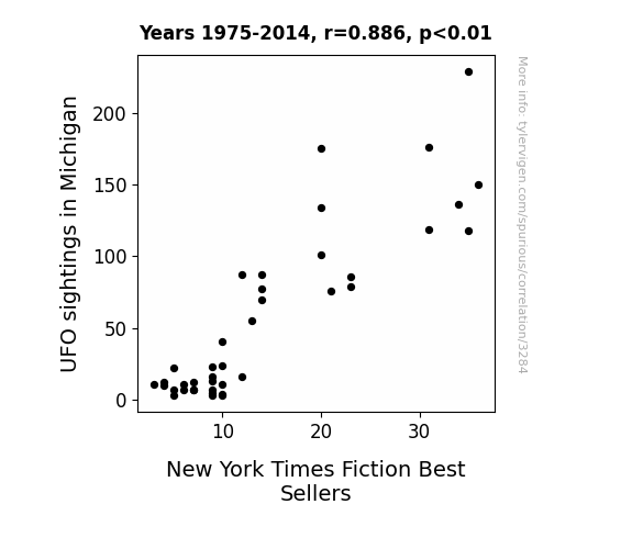 This is exacerbated by the fact that I used "Years" as the base variable. Lots of things happen in a year that are not related to each other! Most studies would use something like "one person" in stead of "one year" to be the "thing" studied. - Observations not independent: For many variables, sequential years are not independent of each other. You will often see trend-lines form. If a population of people is continuously doing something every day, there is no reason to think they would suddenly change how they are doing that thing on January 1. A naive p-value calculation does not take this into account.