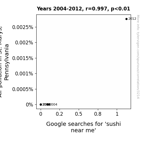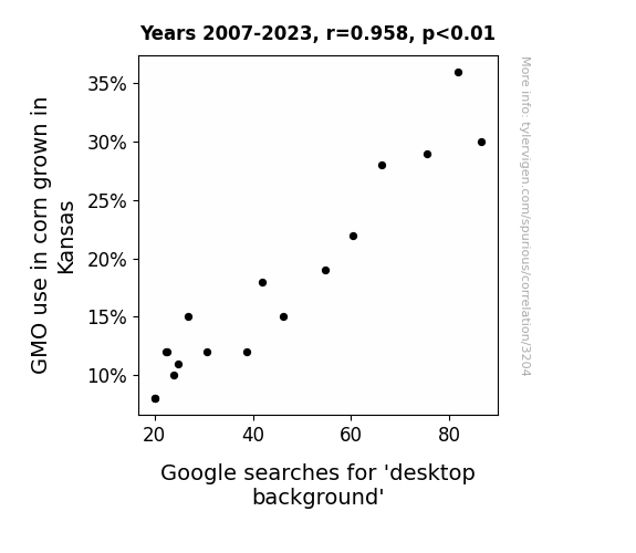 This is exacerbated by the fact that I used "Years" as the base variable. Lots of things happen in a year that are not related to each other! Most studies would use something like "one person" in stead of "one year" to be the "thing" studied. - Observations not independent: For many variables, sequential years are not independent of each other. You will often see trend-lines form. If a population of people is continuously doing something every day, there is no reason to think they would suddenly change how they are doing that thing on January 1. A naive p-value calculation does not take this into account.