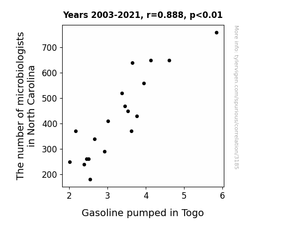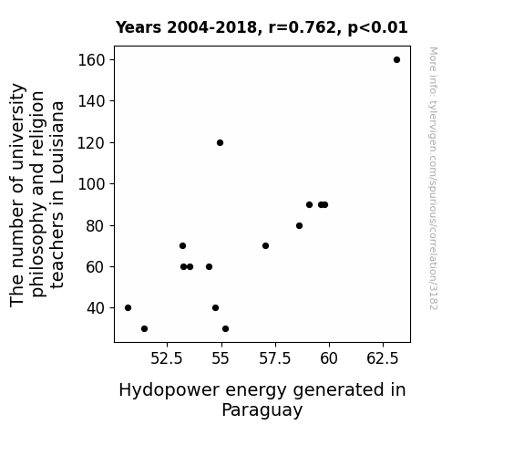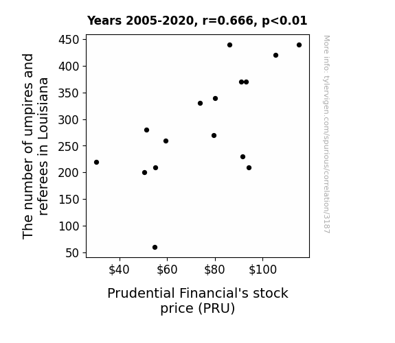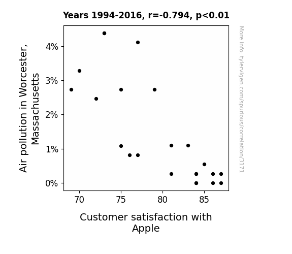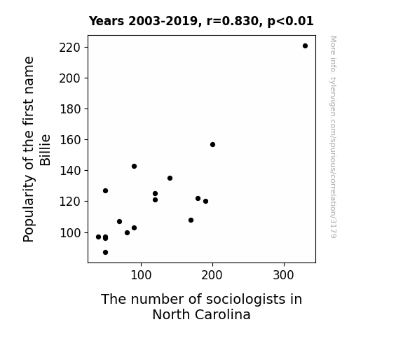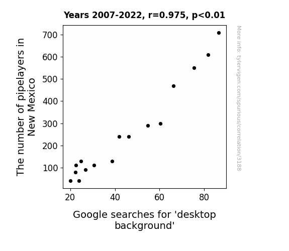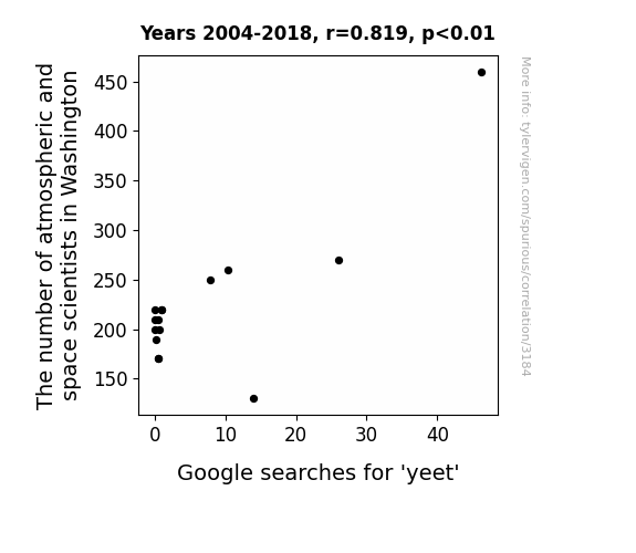 This is exacerbated by the fact that I used "Years" as the base variable. Lots of things happen in a year that are not related to each other! Most studies would use something like "one person" in stead of "one year" to be the "thing" studied. - Observations not independent: For many variables, sequential years are not independent of each other. You will often see trend-lines form. If a population of people is continuously doing something every day, there is no reason to think they would suddenly change how they are doing that thing on January 1. A naive p-value calculation does not take this into account.