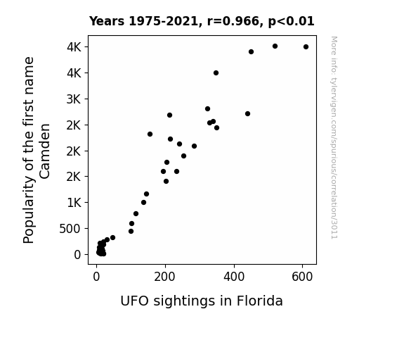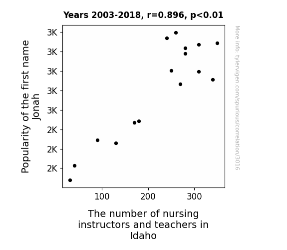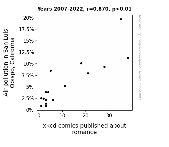 This is exacerbated by the fact that I used "Years" as the base variable. Lots of things happen in a year that are not related to each other! Most studies would use something like "one person" in stead of "one year" to be the "thing" studied. - Observations not independent: For many variables, sequential years are not independent of each other. You will often see trend-lines form. If a population of people is continuously doing something every day, there is no reason to think they would suddenly change how they are doing that thing on January 1. A naive p-value calculation does not take this into account.