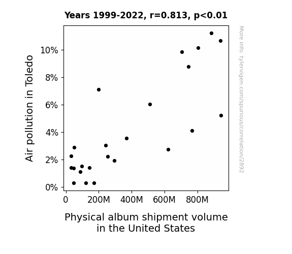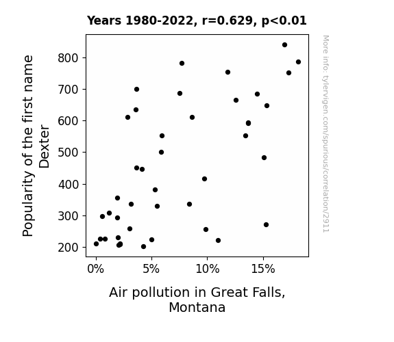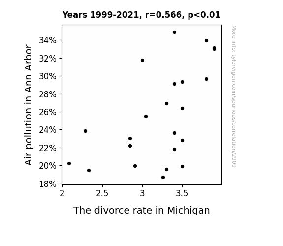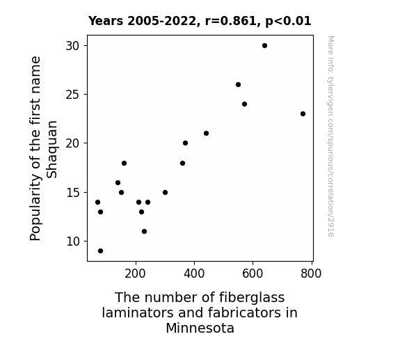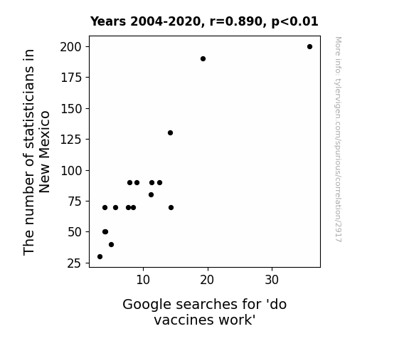 This is exacerbated by the fact that I used "Years" as the base variable. Lots of things happen in a year that are not related to each other! Most studies would use something like "one person" in stead of "one year" to be the "thing" studied. - Observations not independent: For many variables, sequential years are not independent of each other. You will often see trend-lines form. If a population of people is continuously doing something every day, there is no reason to think they would suddenly change how they are doing that thing on January 1. A naive p-value calculation does not take this into account.
