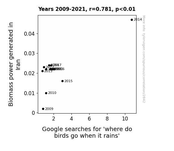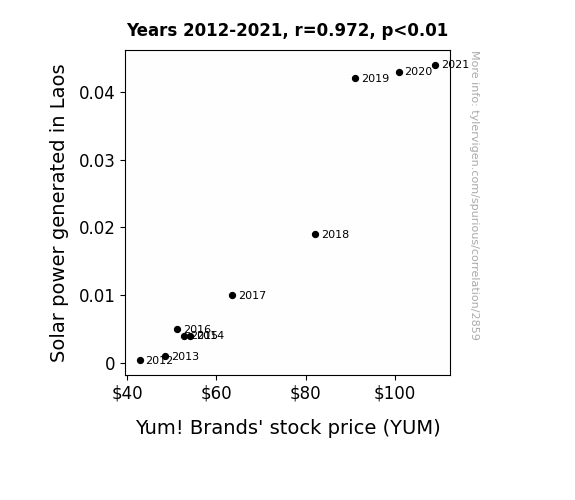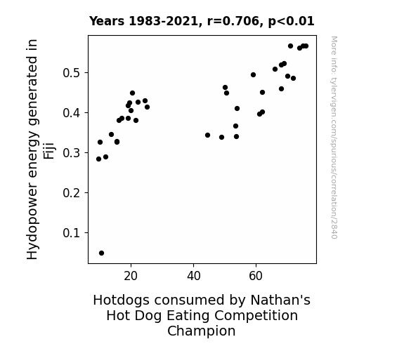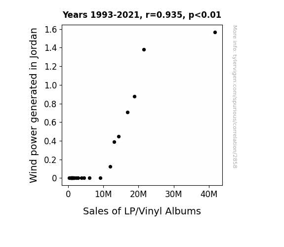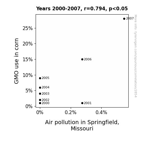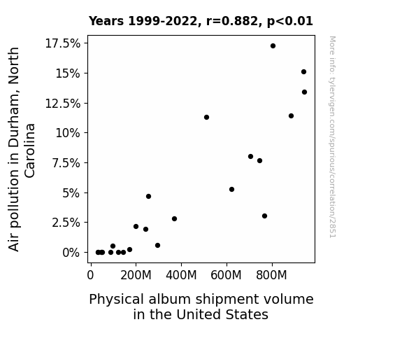 This is exacerbated by the fact that I used "Years" as the base variable. Lots of things happen in a year that are not related to each other! Most studies would use something like "one person" in stead of "one year" to be the "thing" studied. - Observations not independent: For many variables, sequential years are not independent of each other. You will often see trend-lines form. If a population of people is continuously doing something every day, there is no reason to think they would suddenly change how they are doing that thing on January 1. A naive p-value calculation does not take this into account.