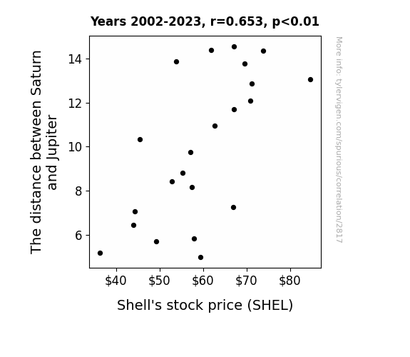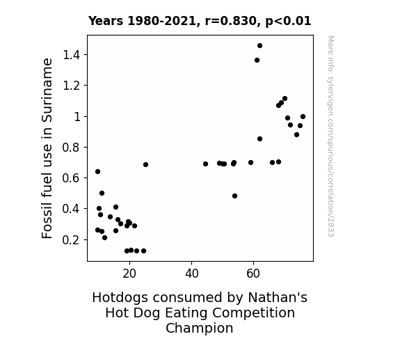 This is exacerbated by the fact that I used "Years" as the base variable. Lots of things happen in a year that are not related to each other! Most studies would use something like "one person" in stead of "one year" to be the "thing" studied. - Observations not independent: For many variables, sequential years are not independent of each other. You will often see trend-lines form. If a population of people is continuously doing something every day, there is no reason to think they would suddenly change how they are doing that thing on January 1. A naive p-value calculation does not take this into account.