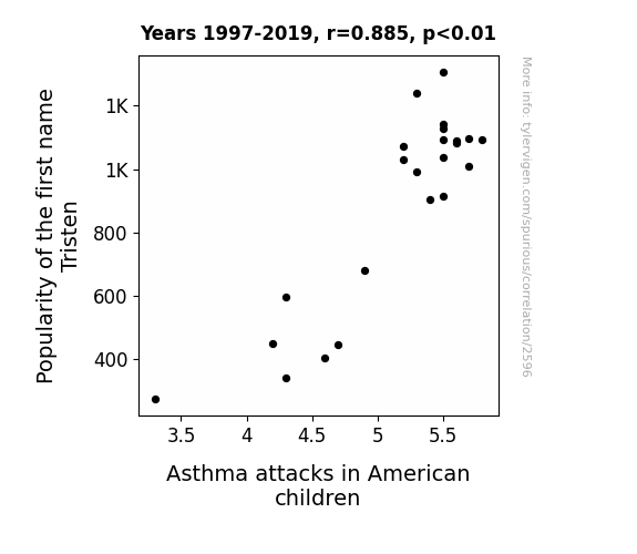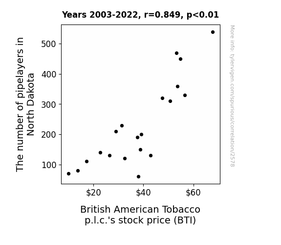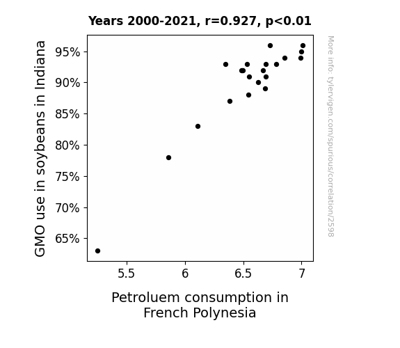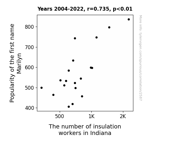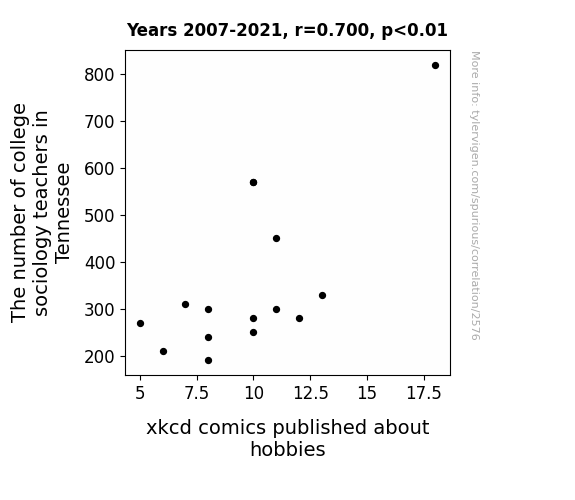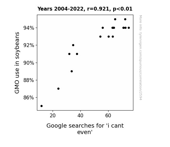 This is exacerbated by the fact that I used "Years" as the base variable. Lots of things happen in a year that are not related to each other! Most studies would use something like "one person" in stead of "one year" to be the "thing" studied. - Observations not independent: For many variables, sequential years are not independent of each other. You will often see trend-lines form. If a population of people is continuously doing something every day, there is no reason to think they would suddenly change how they are doing that thing on January 1. A naive p-value calculation does not take this into account.