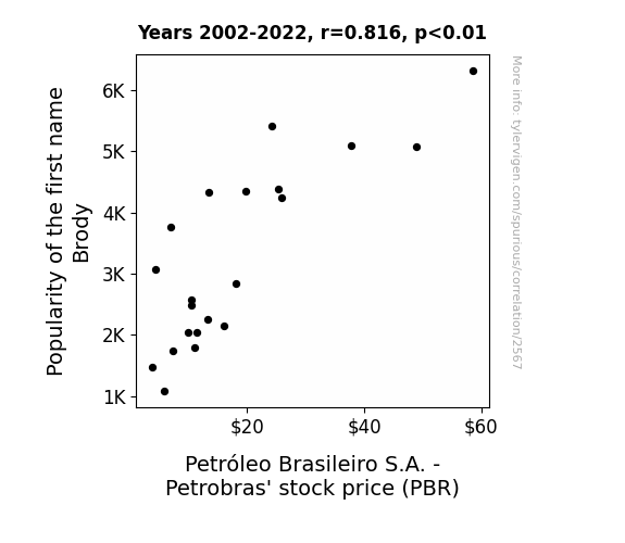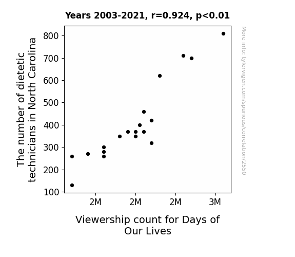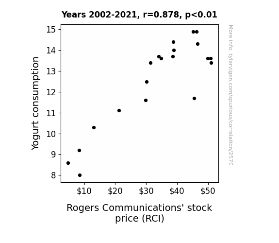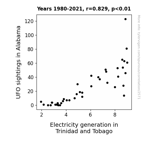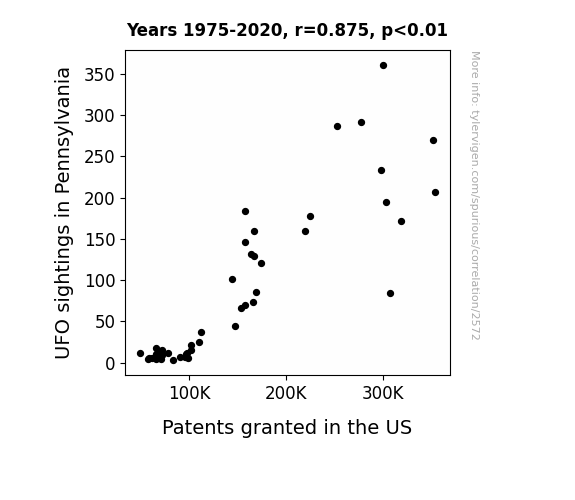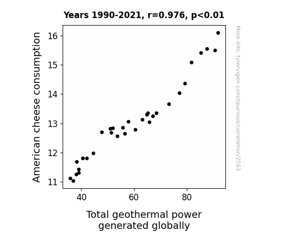 This is exacerbated by the fact that I used "Years" as the base variable. Lots of things happen in a year that are not related to each other! Most studies would use something like "one person" in stead of "one year" to be the "thing" studied. - Observations not independent: For many variables, sequential years are not independent of each other. You will often see trend-lines form. If a population of people is continuously doing something every day, there is no reason to think they would suddenly change how they are doing that thing on January 1. A naive p-value calculation does not take this into account.