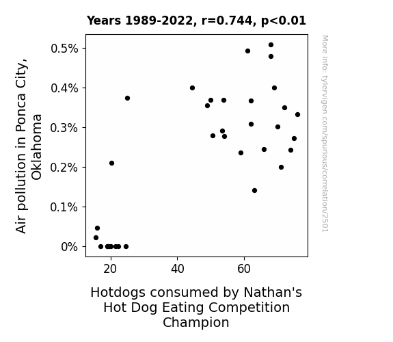 Step 1: Gather a bunch of data. There are 25,156 variables in my database. The data ranges from the mundane (air pollution in Chicago) to the weird (Hotdogs consumed by Nathan's Hot Dog Eating Competition Champion) to the super-niche (How clickbait-y Numberphile YouTube video titles are, as rated by an AI).