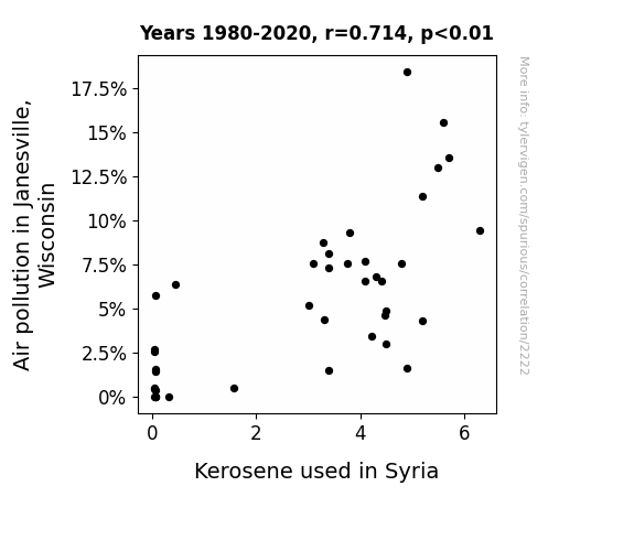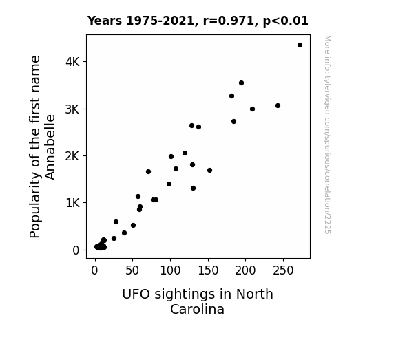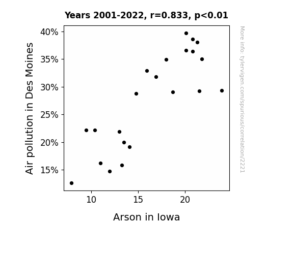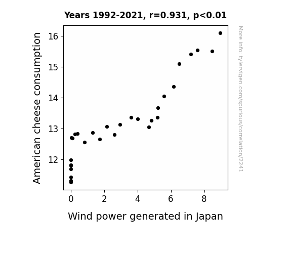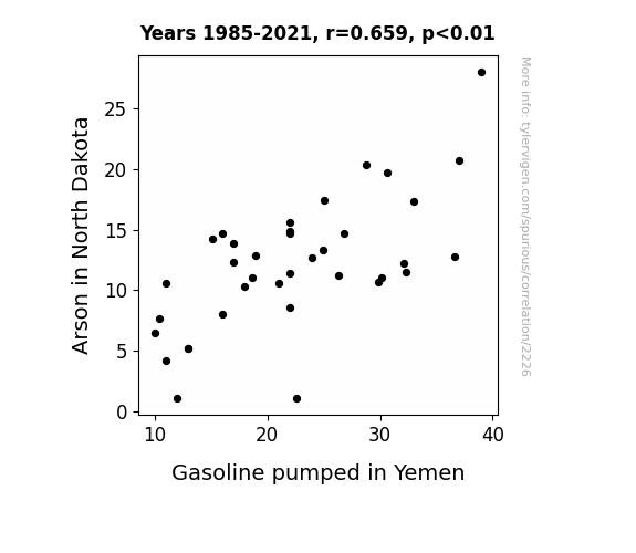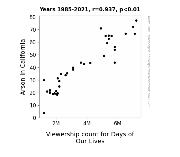 This is exacerbated by the fact that I used "Years" as the base variable. Lots of things happen in a year that are not related to each other! Most studies would use something like "one person" in stead of "one year" to be the "thing" studied. - Observations not independent: For many variables, sequential years are not independent of each other. You will often see trend-lines form. If a population of people is continuously doing something every day, there is no reason to think they would suddenly change how they are doing that thing on January 1. A naive p-value calculation does not take this into account.