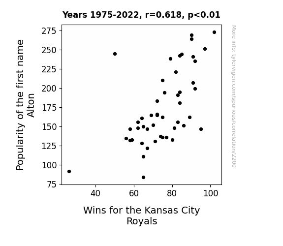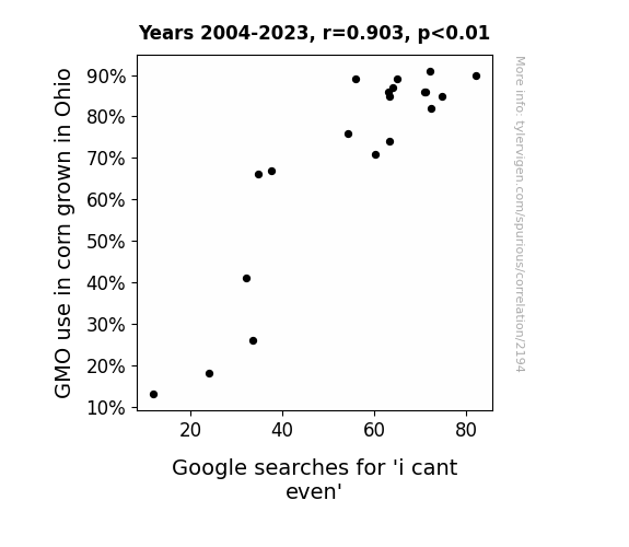 This is exacerbated by the fact that I used "Years" as the base variable. Lots of things happen in a year that are not related to each other! Most studies would use something like "one person" in stead of "one year" to be the "thing" studied. - Observations not independent: For many variables, sequential years are not independent of each other. You will often see trend-lines form. If a population of people is continuously doing something every day, there is no reason to think they would suddenly change how they are doing that thing on January 1. A naive p-value calculation does not take this into account.