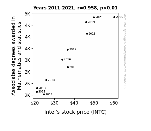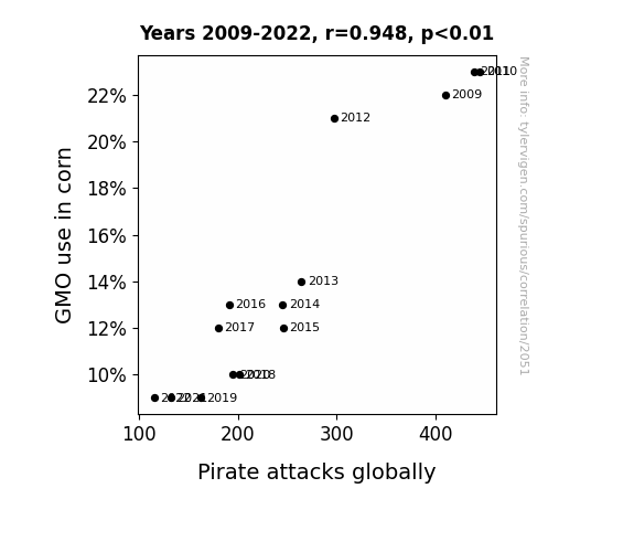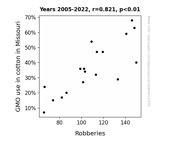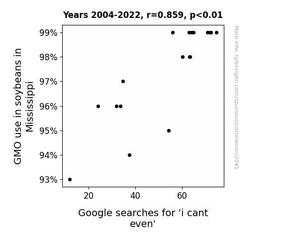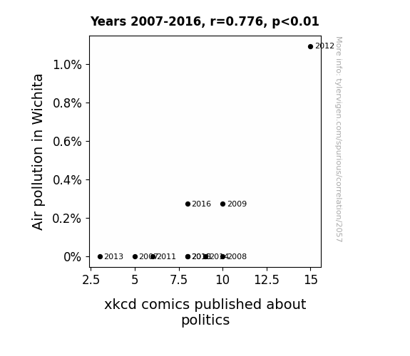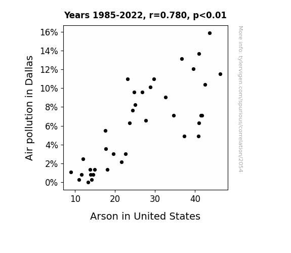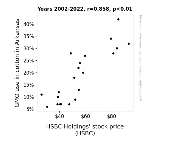 This is exacerbated by the fact that I used "Years" as the base variable. Lots of things happen in a year that are not related to each other! Most studies would use something like "one person" in stead of "one year" to be the "thing" studied. - Observations not independent: For many variables, sequential years are not independent of each other. You will often see trend-lines form. If a population of people is continuously doing something every day, there is no reason to think they would suddenly change how they are doing that thing on January 1. A naive p-value calculation does not take this into account.