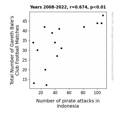 This is exacerbated by the fact that I used "Years" as the base variable. Lots of things happen in a year that are not related to each other! Most studies would use something like "one person" in stead of "one year" to be the "thing" studied. - Observations not independent: For many variables, sequential years are not independent of each other. You will often see trend-lines form. If a population of people is continuously doing something every day, there is no reason to think they would suddenly change how they are doing that thing on January 1. A naive p-value calculation does not take this into account.