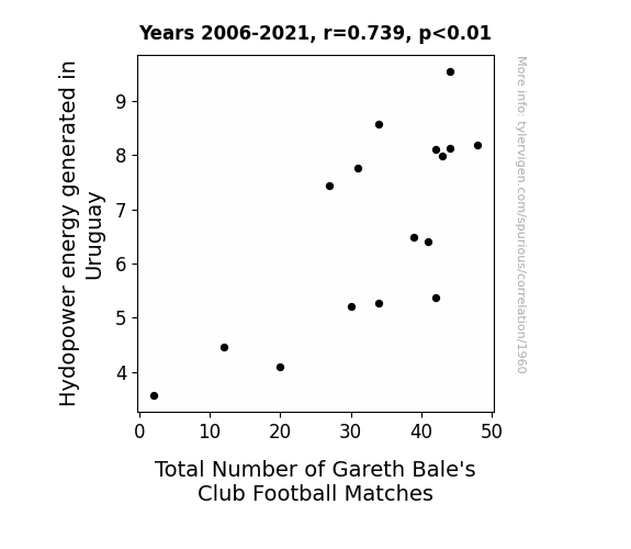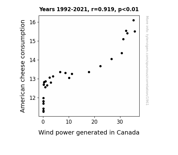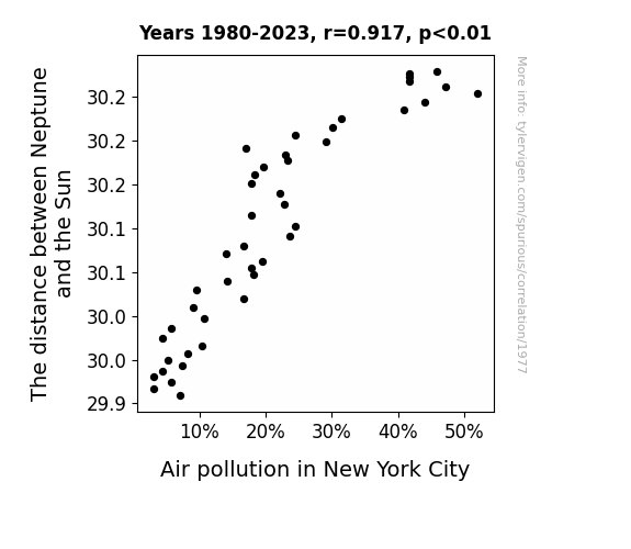 This is exacerbated by the fact that I used "Years" as the base variable. Lots of things happen in a year that are not related to each other! Most studies would use something like "one person" in stead of "one year" to be the "thing" studied. - Observations not independent: For many variables, sequential years are not independent of each other. You will often see trend-lines form. If a population of people is continuously doing something every day, there is no reason to think they would suddenly change how they are doing that thing on January 1. A naive p-value calculation does not take this into account.