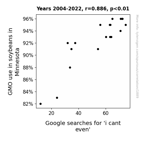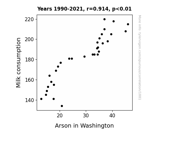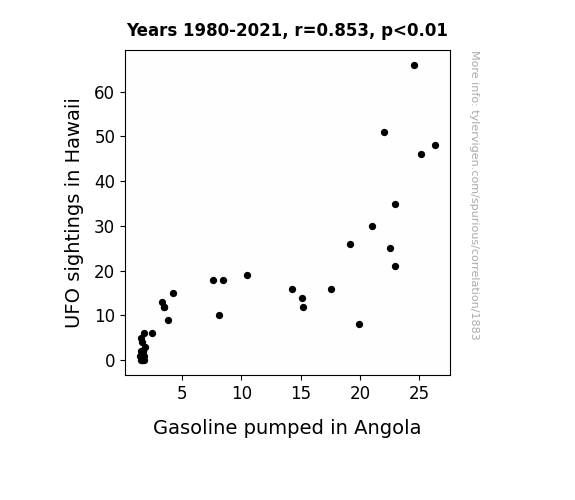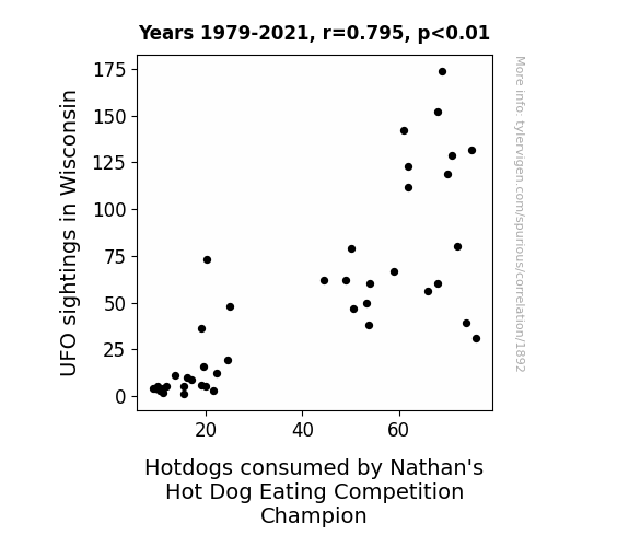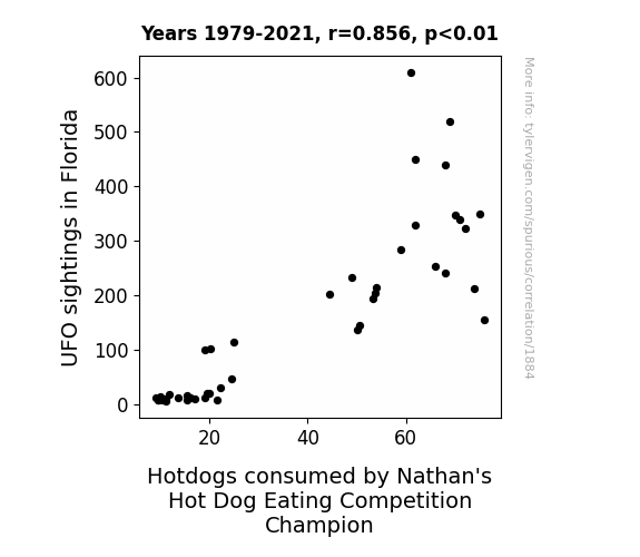 This is exacerbated by the fact that I used "Years" as the base variable. Lots of things happen in a year that are not related to each other! Most studies would use something like "one person" in stead of "one year" to be the "thing" studied. - Observations not independent: For many variables, sequential years are not independent of each other. You will often see trend-lines form. If a population of people is continuously doing something every day, there is no reason to think they would suddenly change how they are doing that thing on January 1. A naive p-value calculation does not take this into account.