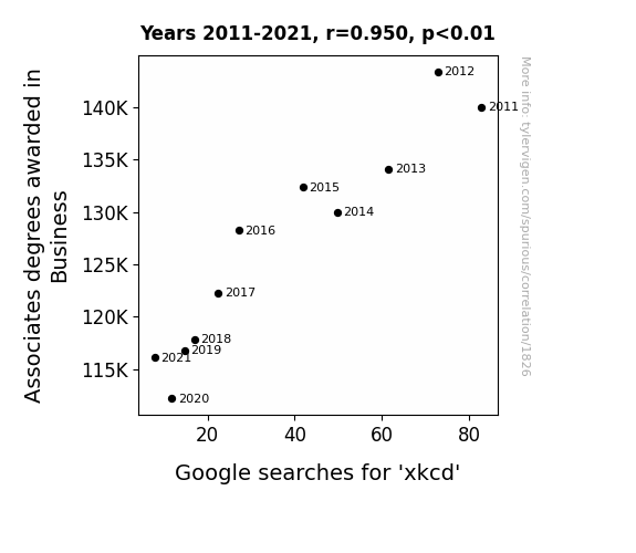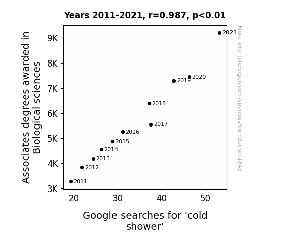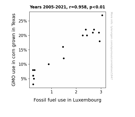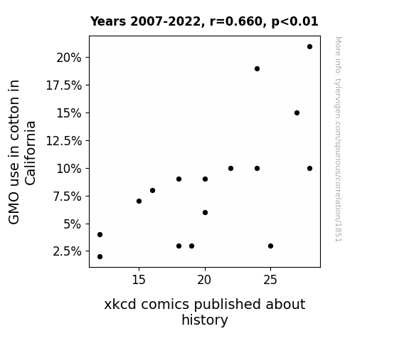 This is exacerbated by the fact that I used "Years" as the base variable. Lots of things happen in a year that are not related to each other! Most studies would use something like "one person" in stead of "one year" to be the "thing" studied. - Observations not independent: For many variables, sequential years are not independent of each other. You will often see trend-lines form. If a population of people is continuously doing something every day, there is no reason to think they would suddenly change how they are doing that thing on January 1. A naive p-value calculation does not take this into account.