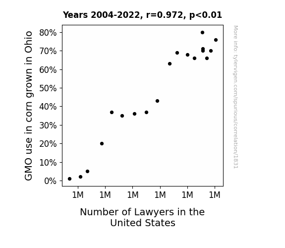 - Data dredging: I have 25,156 variables in my database. I compare all these variables against each other to find ones that randomly match up. That's 632,824,336 correlation calculations! This is called “data dredging.”