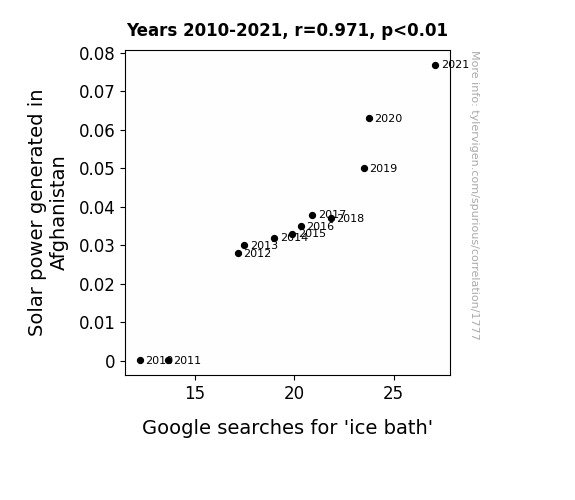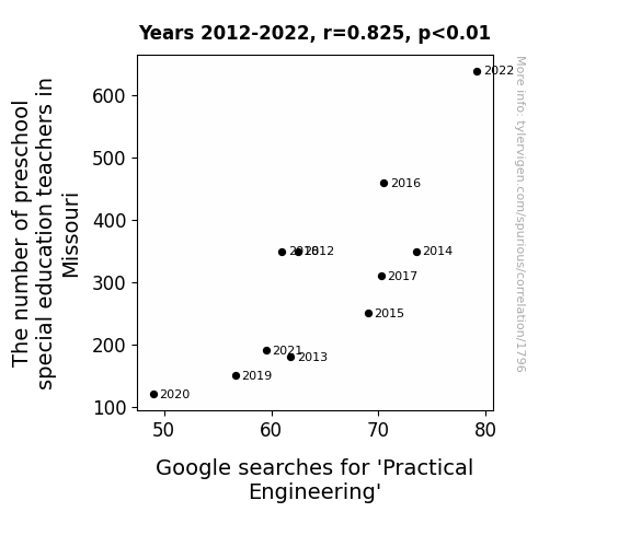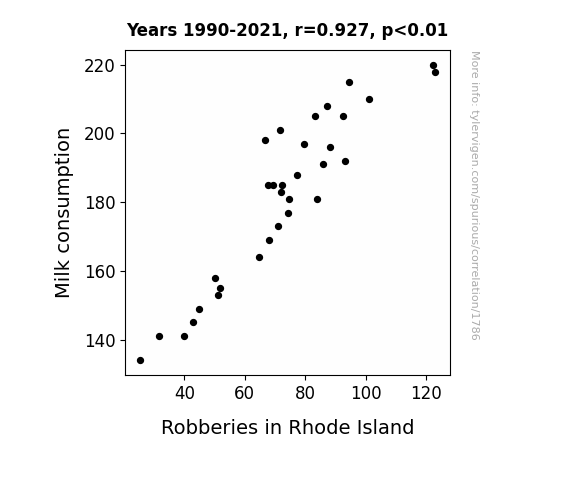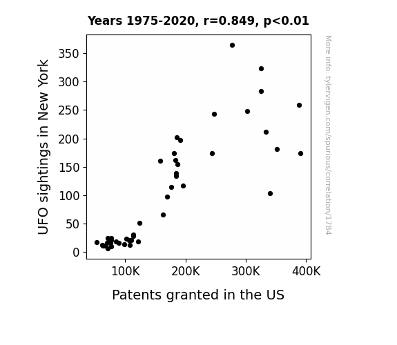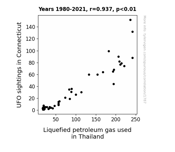 This is exacerbated by the fact that I used "Years" as the base variable. Lots of things happen in a year that are not related to each other! Most studies would use something like "one person" in stead of "one year" to be the "thing" studied. - Observations not independent: For many variables, sequential years are not independent of each other. You will often see trend-lines form. If a population of people is continuously doing something every day, there is no reason to think they would suddenly change how they are doing that thing on January 1. A naive p-value calculation does not take this into account.