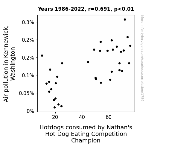 Step 1: Gather a bunch of data. There are 25,156 variables in my database. The data ranges from the mundane (air pollution in Chicago) to the weird (Hotdogs consumed by Nathan's Hot Dog Eating Competition Champion) to the super-niche (How clickbait-y Numberphile YouTube video titles are, as rated by an AI).
