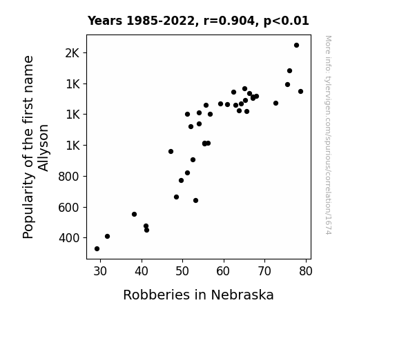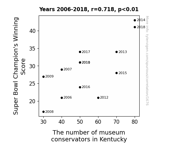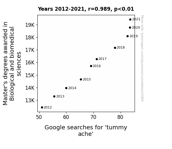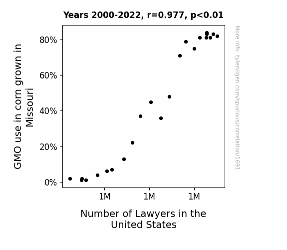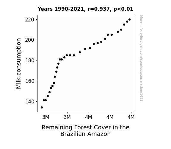 This is exacerbated by the fact that I used "Years" as the base variable. Lots of things happen in a year that are not related to each other! Most studies would use something like "one person" in stead of "one year" to be the "thing" studied. - Observations not independent: For many variables, sequential years are not independent of each other. You will often see trend-lines form. If a population of people is continuously doing something every day, there is no reason to think they would suddenly change how they are doing that thing on January 1. A naive p-value calculation does not take this into account.