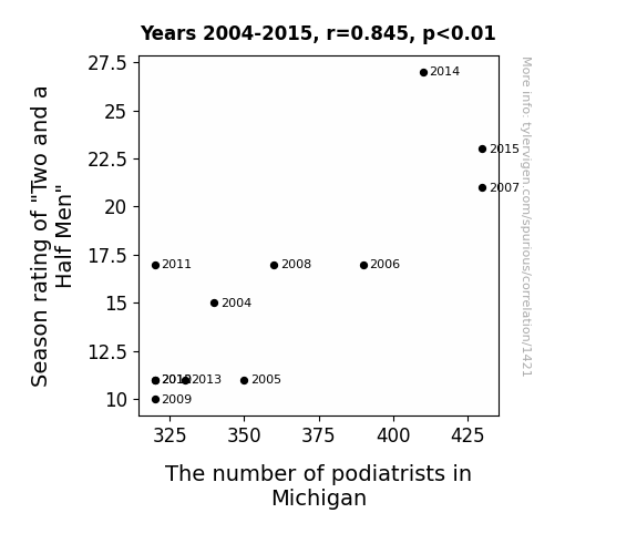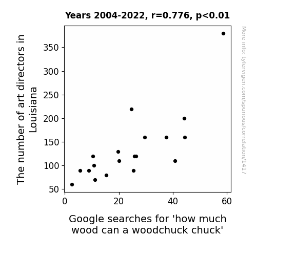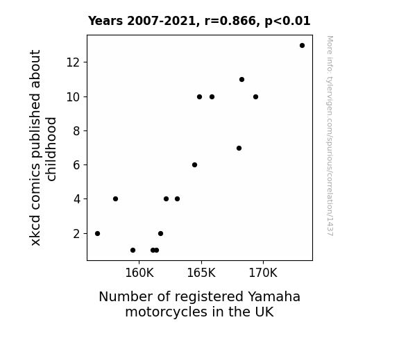 This is exacerbated by the fact that I used "Years" as the base variable. Lots of things happen in a year that are not related to each other! Most studies would use something like "one person" in stead of "one year" to be the "thing" studied. - Observations not independent: For many variables, sequential years are not independent of each other. You will often see trend-lines form. If a population of people is continuously doing something every day, there is no reason to think they would suddenly change how they are doing that thing on January 1. A naive p-value calculation does not take this into account.