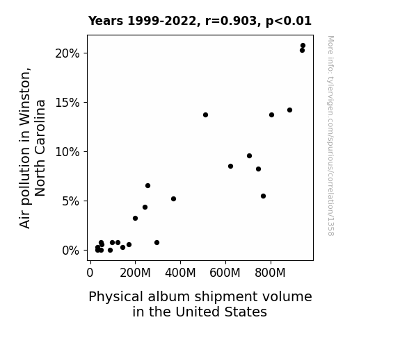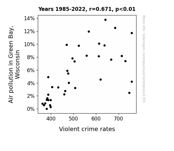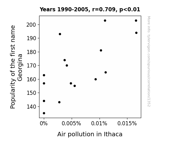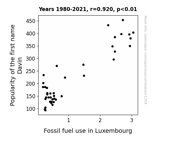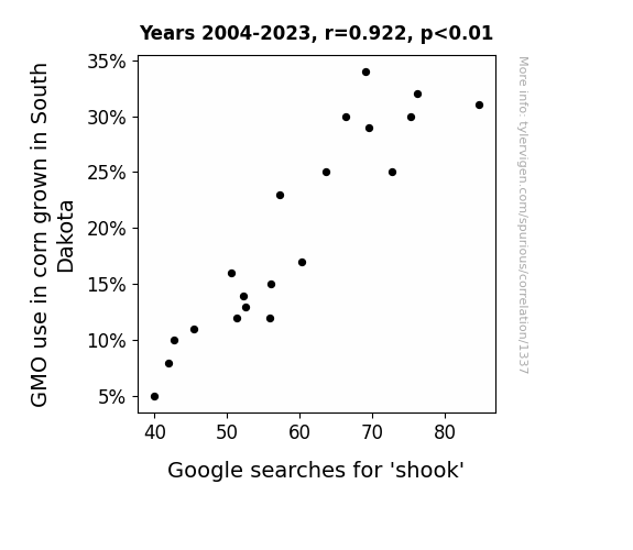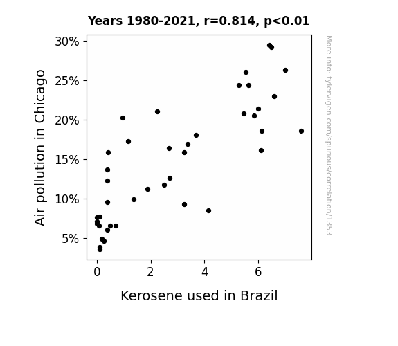 This is exacerbated by the fact that I used "Years" as the base variable. Lots of things happen in a year that are not related to each other! Most studies would use something like "one person" in stead of "one year" to be the "thing" studied. - Observations not independent: For many variables, sequential years are not independent of each other. You will often see trend-lines form. If a population of people is continuously doing something every day, there is no reason to think they would suddenly change how they are doing that thing on January 1. A naive p-value calculation does not take this into account.