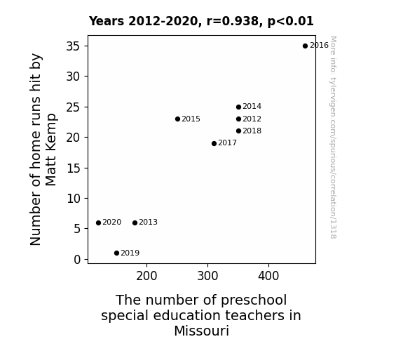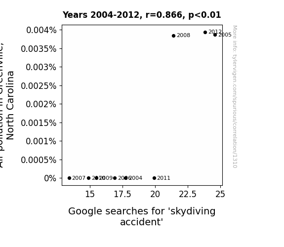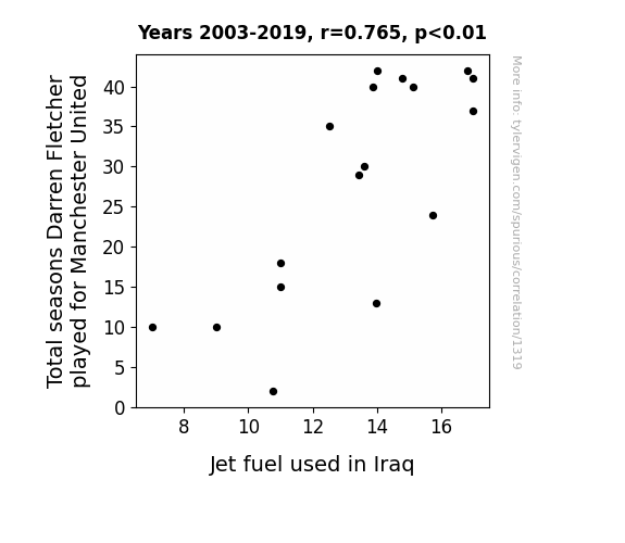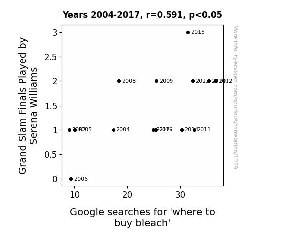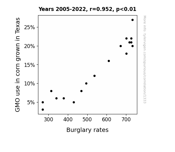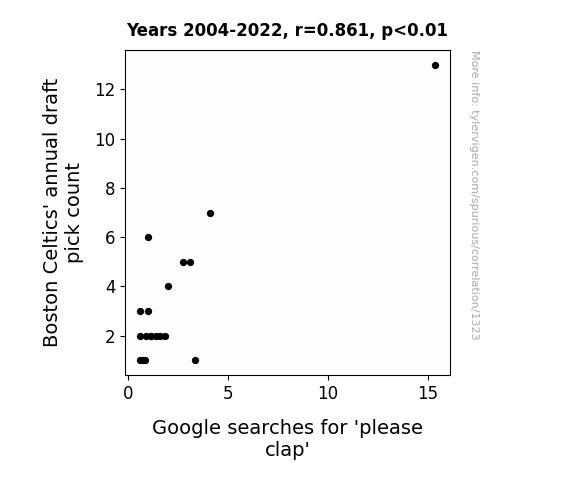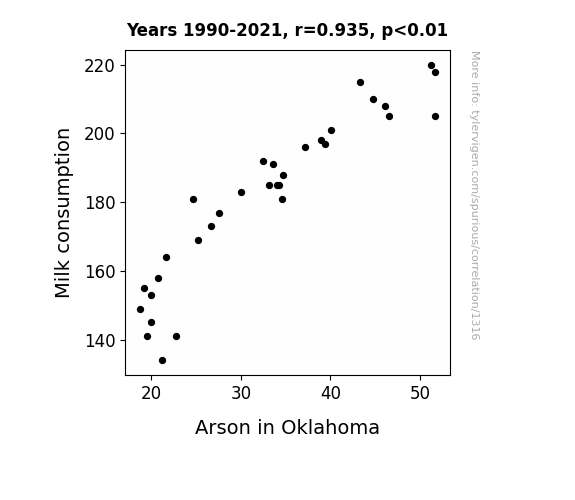 This is exacerbated by the fact that I used "Years" as the base variable. Lots of things happen in a year that are not related to each other! Most studies would use something like "one person" in stead of "one year" to be the "thing" studied. - Observations not independent: For many variables, sequential years are not independent of each other. You will often see trend-lines form. If a population of people is continuously doing something every day, there is no reason to think they would suddenly change how they are doing that thing on January 1. A naive p-value calculation does not take this into account.