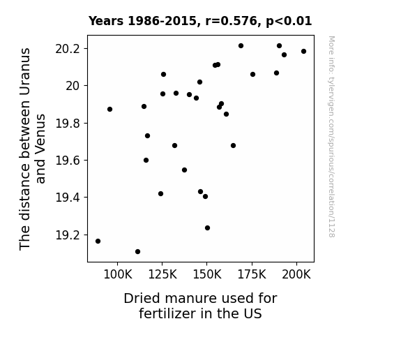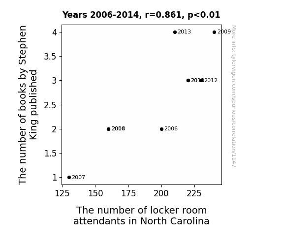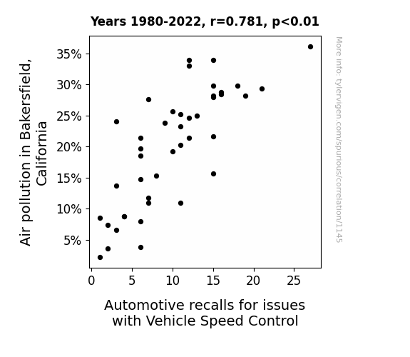 This is exacerbated by the fact that I used "Years" as the base variable. Lots of things happen in a year that are not related to each other! Most studies would use something like "one person" in stead of "one year" to be the "thing" studied. - Observations not independent: For many variables, sequential years are not independent of each other. You will often see trend-lines form. If a population of people is continuously doing something every day, there is no reason to think they would suddenly change how they are doing that thing on January 1. A naive p-value calculation does not take this into account.