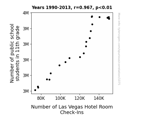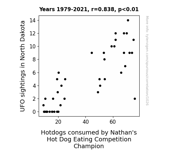 This is exacerbated by the fact that I used "Years" as the base variable. Lots of things happen in a year that are not related to each other! Most studies would use something like "one person" in stead of "one year" to be the "thing" studied. - Observations not independent: For many variables, sequential years are not independent of each other. You will often see trend-lines form. If a population of people is continuously doing something every day, there is no reason to think they would suddenly change how they are doing that thing on January 1. A naive p-value calculation does not take this into account.