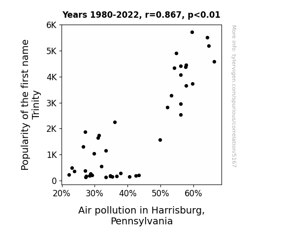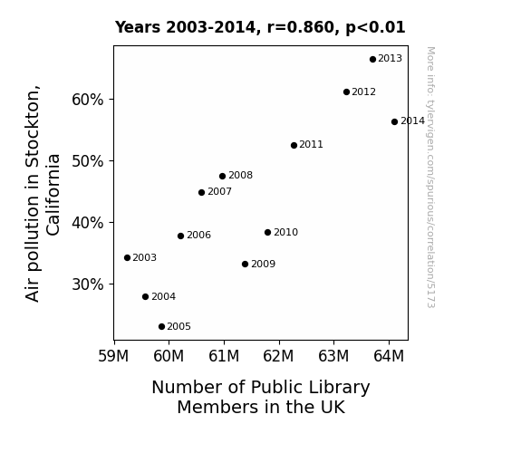 This is exacerbated by the fact that I used "Years" as the base variable. Lots of things happen in a year that are not related to each other! Most studies would use something like "one person" in stead of "one year" to be the "thing" studied. - Observations not independent: For many variables, sequential years are not independent of each other. You will often see trend-lines form. If a population of people is continuously doing something every day, there is no reason to think they would suddenly change how they are doing that thing on January 1. A naive p-value calculation does not take this into account.