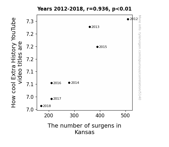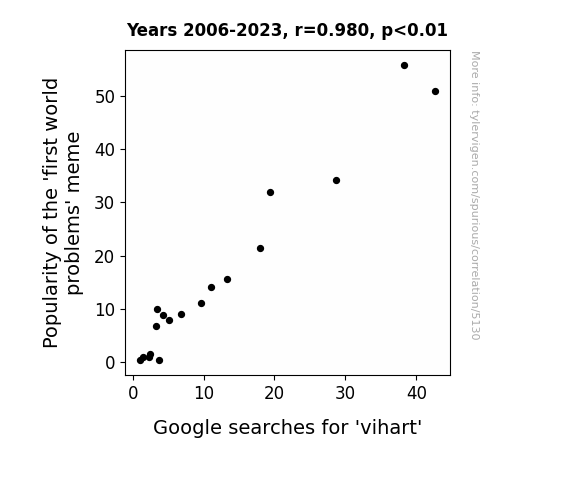 This is exacerbated by the fact that I used "Years" as the base variable. Lots of things happen in a year that are not related to each other! Most studies would use something like "one person" in stead of "one year" to be the "thing" studied. - Observations not independent: For many variables, sequential years are not independent of each other. You will often see trend-lines form. If a population of people is continuously doing something every day, there is no reason to think they would suddenly change how they are doing that thing on January 1. A naive p-value calculation does not take this into account.