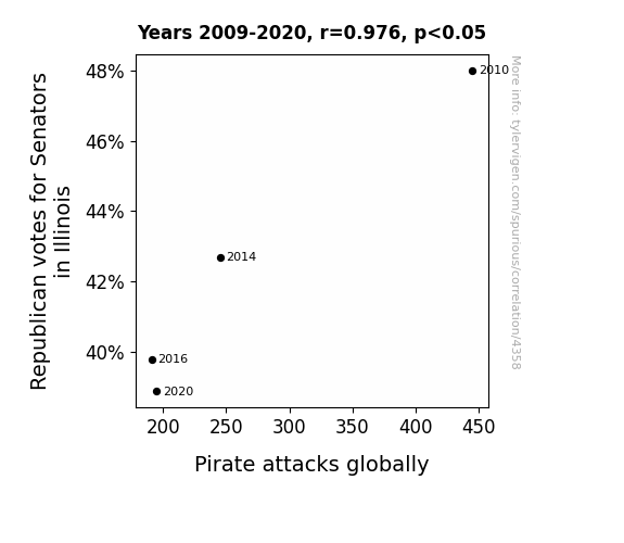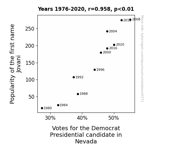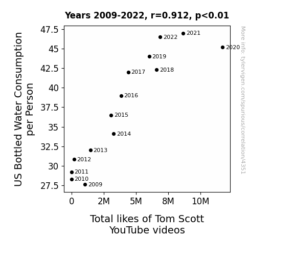 This is exacerbated by the fact that I used "Years" as the base variable. Lots of things happen in a year that are not related to each other! Most studies would use something like "one person" in stead of "one year" to be the "thing" studied. - Observations not independent: For many variables, sequential years are not independent of each other. You will often see trend-lines form. If a population of people is continuously doing something every day, there is no reason to think they would suddenly change how they are doing that thing on January 1. A naive p-value calculation does not take this into account.