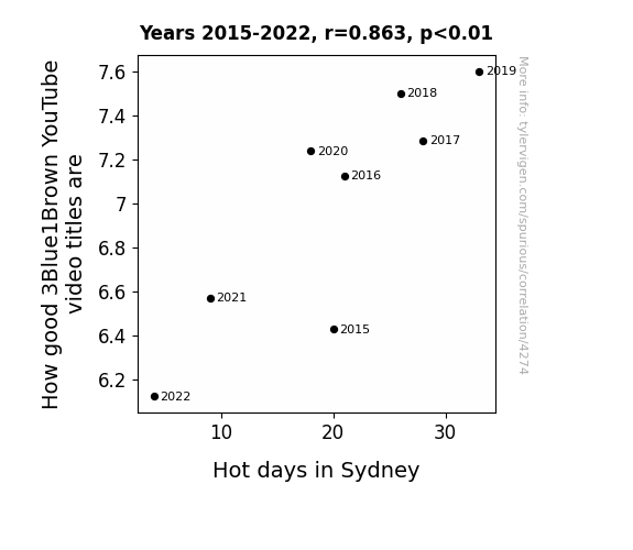 Step 1: Gather a bunch of data. There are 25,156 variables in my database. The data ranges from the mundane (air pollution in Chicago) to the weird (Hotdogs consumed by Nathan's Hot Dog Eating Competition Champion) to the super-niche (How clickbait-y Numberphile YouTube video titles are, as rated by an AI).