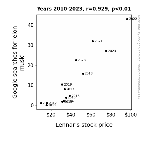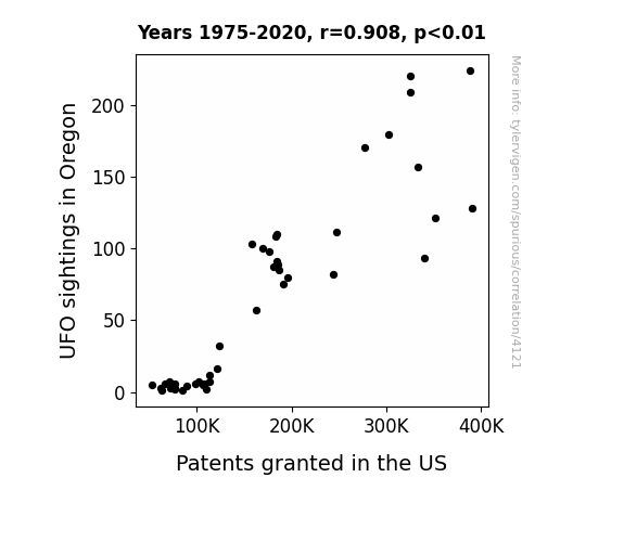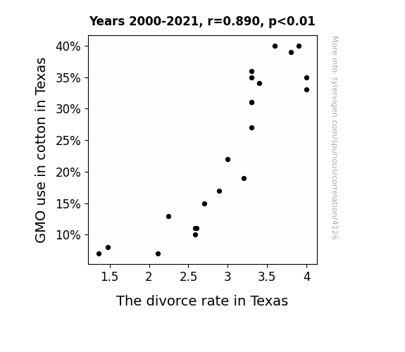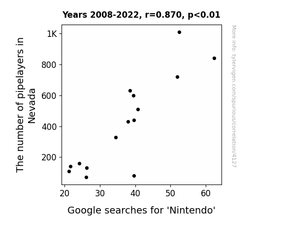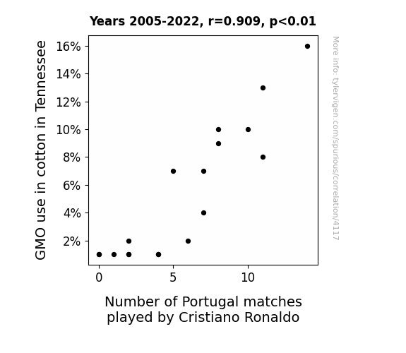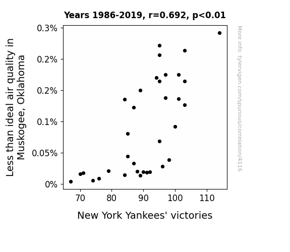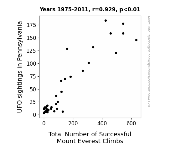 This is exacerbated by the fact that I used "Years" as the base variable. Lots of things happen in a year that are not related to each other! Most studies would use something like "one person" in stead of "one year" to be the "thing" studied. - Observations not independent: For many variables, sequential years are not independent of each other. You will often see trend-lines form. If a population of people is continuously doing something every day, there is no reason to think they would suddenly change how they are doing that thing on January 1. A naive p-value calculation does not take this into account.