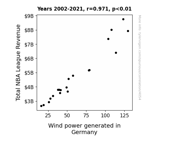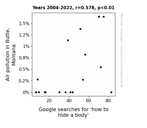 This is exacerbated by the fact that I used "Years" as the base variable. Lots of things happen in a year that are not related to each other! Most studies would use something like "one person" in stead of "one year" to be the "thing" studied. - Observations not independent: For many variables, sequential years are not independent of each other. You will often see trend-lines form. If a population of people is continuously doing something every day, there is no reason to think they would suddenly change how they are doing that thing on January 1. A naive p-value calculation does not take this into account.