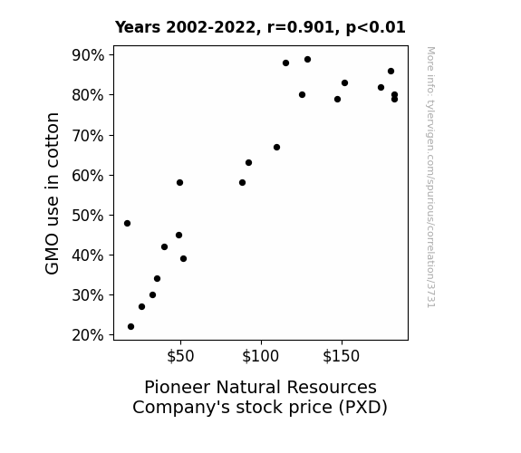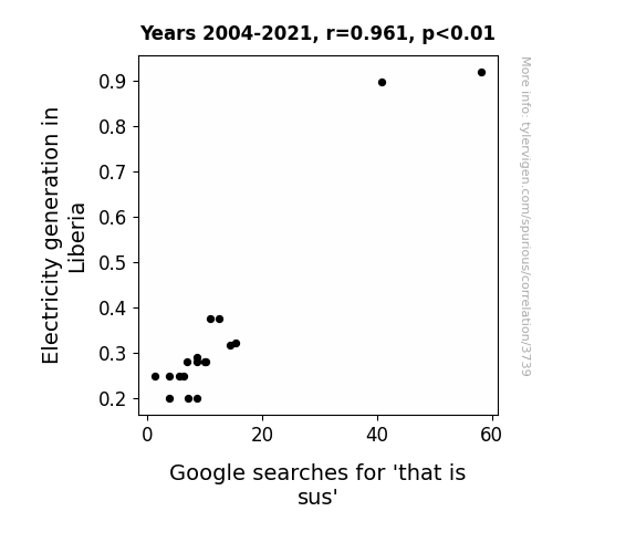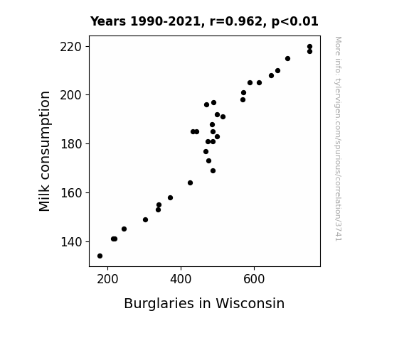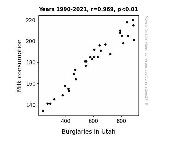 This is exacerbated by the fact that I used "Years" as the base variable. Lots of things happen in a year that are not related to each other! Most studies would use something like "one person" in stead of "one year" to be the "thing" studied. - Observations not independent: For many variables, sequential years are not independent of each other. You will often see trend-lines form. If a population of people is continuously doing something every day, there is no reason to think they would suddenly change how they are doing that thing on January 1. A naive p-value calculation does not take this into account.