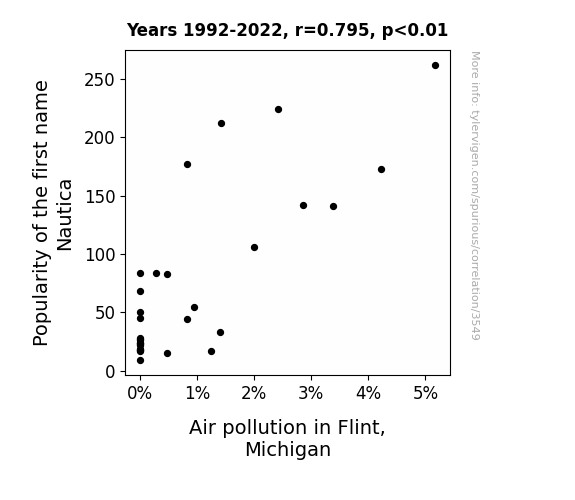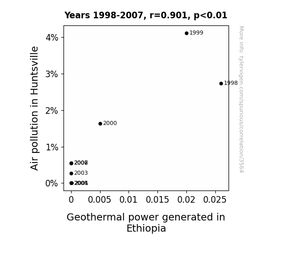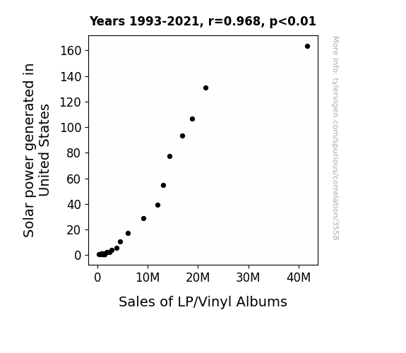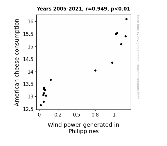 This is exacerbated by the fact that I used "Years" as the base variable. Lots of things happen in a year that are not related to each other! Most studies would use something like "one person" in stead of "one year" to be the "thing" studied. - Observations not independent: For many variables, sequential years are not independent of each other. You will often see trend-lines form. If a population of people is continuously doing something every day, there is no reason to think they would suddenly change how they are doing that thing on January 1. A naive p-value calculation does not take this into account.