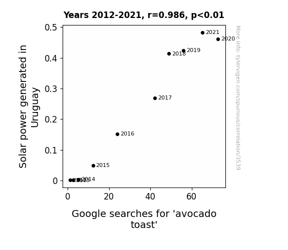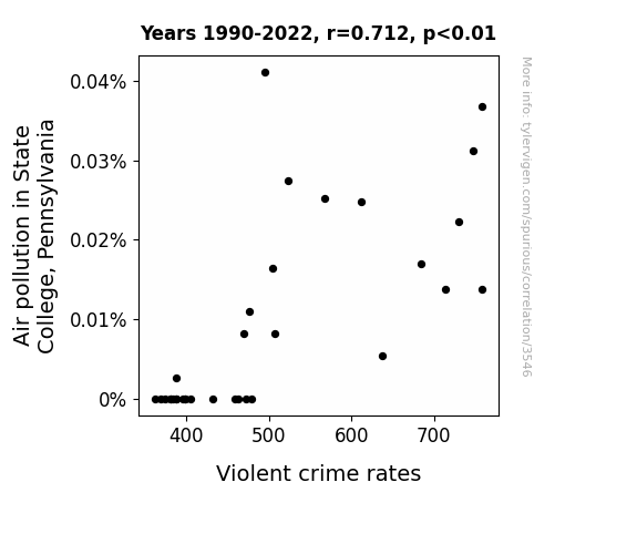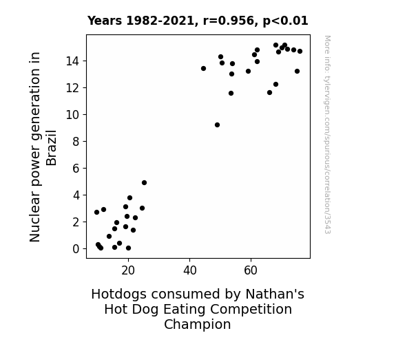 This is exacerbated by the fact that I used "Years" as the base variable. Lots of things happen in a year that are not related to each other! Most studies would use something like "one person" in stead of "one year" to be the "thing" studied. - Observations not independent: For many variables, sequential years are not independent of each other. You will often see trend-lines form. If a population of people is continuously doing something every day, there is no reason to think they would suddenly change how they are doing that thing on January 1. A naive p-value calculation does not take this into account.