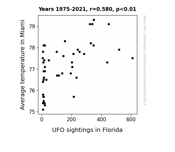 This means 33.6% of the change in the one variable (i.e., UFO sightings in Florida) is predictable based on the change in the other (i.e., Average temperature in Miami) over the 47 years from 1975 through 2021.