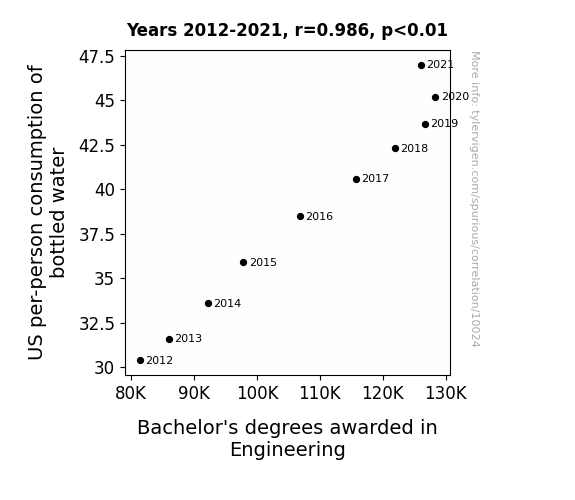 This means 97.2% of the change in the one variable (i.e., Bachelor's degrees awarded in Engineering) is predictable based on the change in the other (i.e., US per-person consumption of bottled water) over the 10 years from 2012 through 2021.