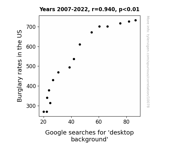 This means 88.3% of the change in the one variable (i.e., Google searches for 'desktop background') is predictable based on the change in the other (i.e., Burglary rates in the US) over the 16 years from 2007 through 2022.