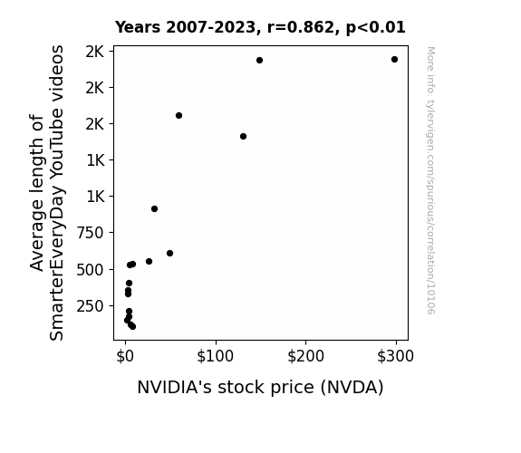 This means 74.2% of the change in the one variable (i.e., NVIDIA's stock price (NVDA)) is predictable based on the change in the other (i.e., Average length of SmarterEveryDay YouTube videos) over the 17 years from 2007 through 2023.