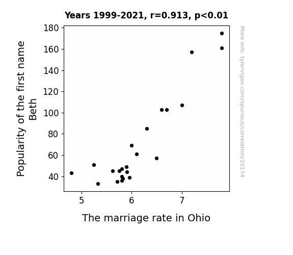 This means 83.4% of the change in the one variable (i.e., The marriage rate in Ohio) is predictable based on the change in the other (i.e., Popularity of the first name Beth) over the 23 years from 1999 through 2021.