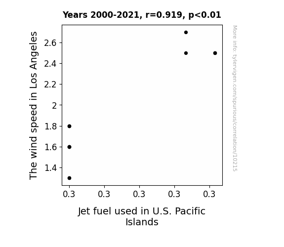 This means 84.4% of the change in the one variable (i.e., Jet fuel used in U.S. Pacific Islands) is predictable based on the change in the other (i.e., The wind speed in Los Angeles) over the 21 years from 2000 through 2021.
