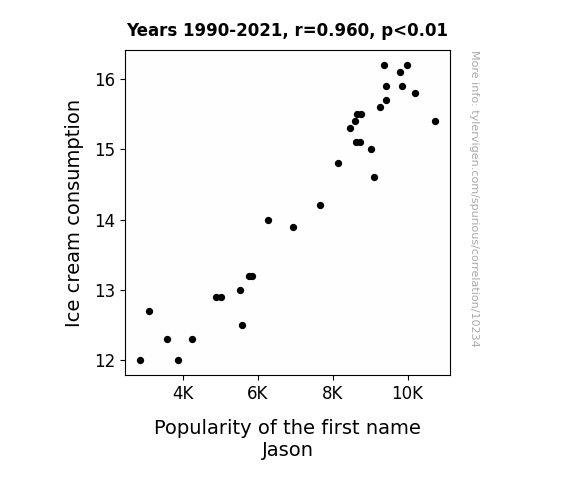 This means 92.1% of the change in the one variable (i.e., Popularity of the first name Jason) is predictable based on the change in the other (i.e., Ice cream consumption) over the 32 years from 1990 through 2021.