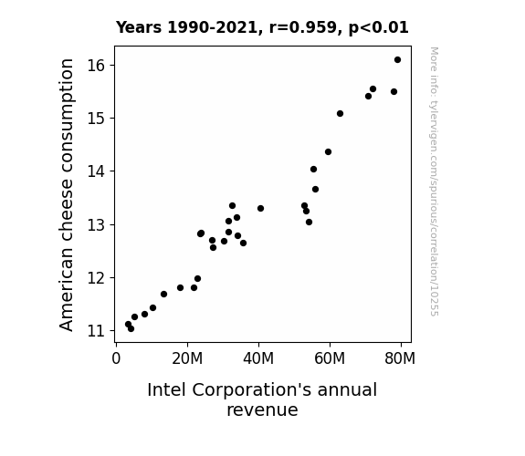 This means 92% of the change in the one variable (i.e., Intel Corporation's annual revenue) is predictable based on the change in the other (i.e., American cheese consumption) over the 32 years from 1990 through 2021.
