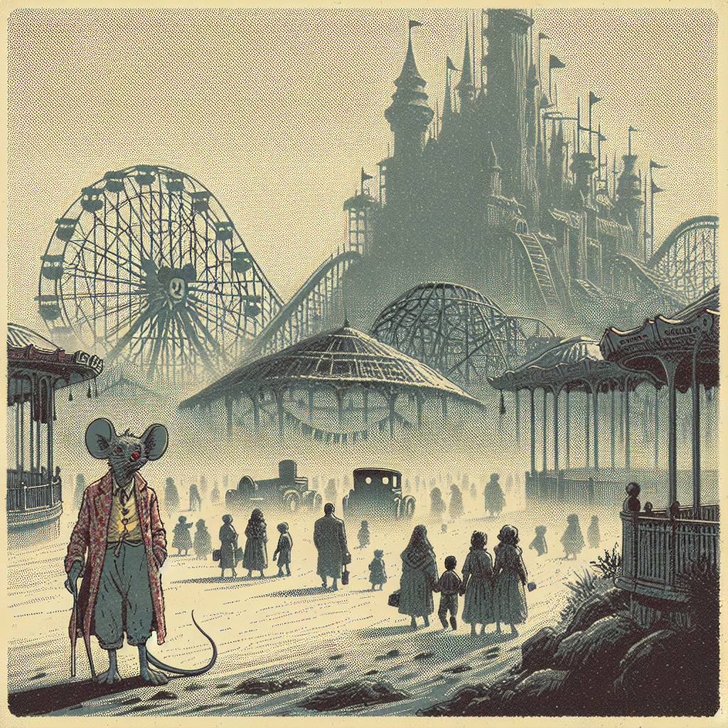 ChatGPT: Generate an image of a classic 1960s comic-book-style illustration with muted colors and a dotted halftone pattern, depicting a scene at Disneyland. In the illustration, the smog-filled sky hangs heavily over the iconic castle, barely visible through the haze. Dust and dirt coat the rides and attractions, creating a weary and oppressive atmosphere. A tired-looking Mickey Mouse struggles to catch his breath as he walks through the nearly empty park, with only a handful of scattered visitors. The typical bustling energy and excitement of Disneyland is noticeably absent in this surreal and muted representation.