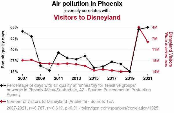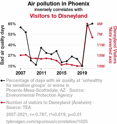 This means 61.9% of the change in the one variable (i.e., Visitors to Disneyland) is predictable based on the change in the other (i.e., Air pollution in Phoenix) over the 15 years from 2007 through 2021.