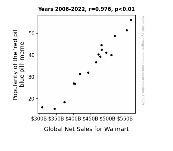 This means 95.3% of the change in the one variable (i.e., Global Net Sales for Walmart) is predictable based on the change in the other (i.e., Popularity of the 'red pill blue pill' meme) over the 17 years from 2006 through 2022.