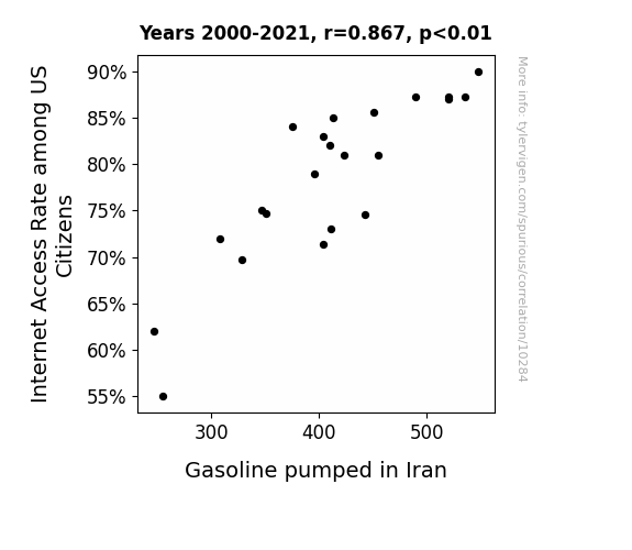 This means 75.2% of the change in the one variable (i.e., Gasoline pumped in Iran) is predictable based on the change in the other (i.e., Internet Access Rate among US Citizens) over the 22 years from 2000 through 2021.