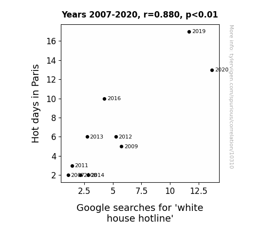 This means 77.5% of the change in the one variable (i.e., Google searches for 'white house hotline') is predictable based on the change in the other (i.e., Hot days in Paris) over the 10 years from 2007 through 2020.