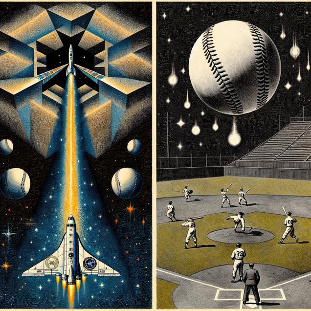 ChatGPT: [ inspired by bauhaus ] Generate an image depicting a scene where a rocket adorned with the NASA logo blasts off into space, leaving a vivid trail of stardust in its path. As the rocket ascends, envision a baseball field featuring players from the Minnesota Twins battering up, swinging with immense force that propels the baseballs skyward like shooting stars. This unique imagery symbolizes the concept of reaching for the stars, both in space exploration and in athletic pursuit.